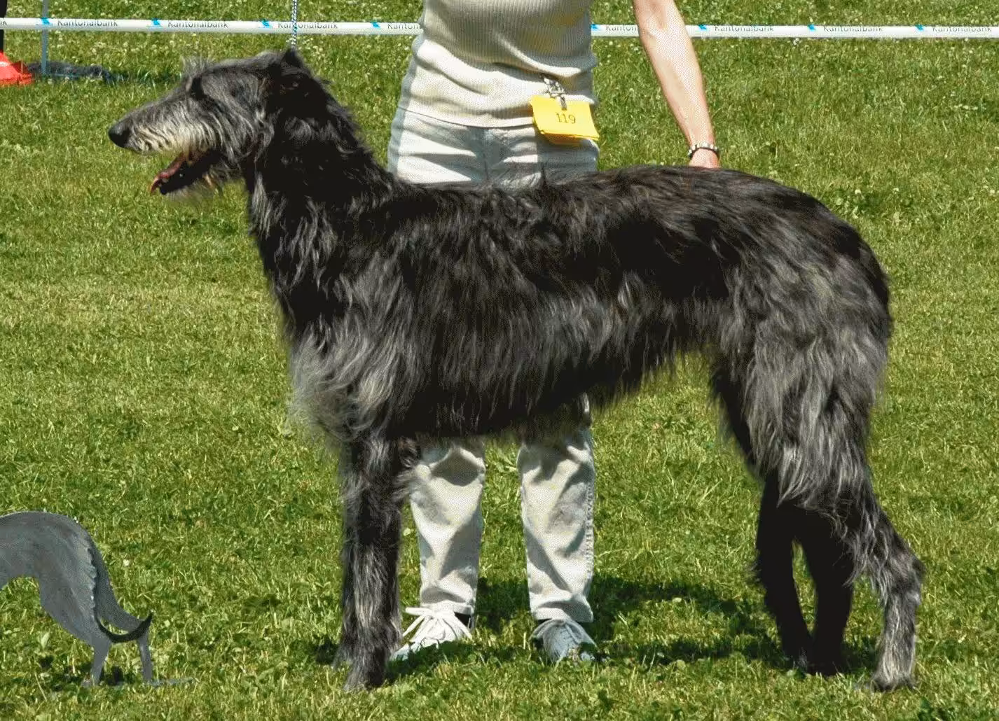Leider hatte Tulla im Alter von 2 Jahren einen sehr schweren Coursing-Unfall, bei welchem sie einige Meter hinunterfiel und auf Kopf und Genick landete. Es grenzte an ein Wunder, dass sie einigermassen heil davonkam. Allerdings blieben Wirbelverschiebungen hauptsächlich an der Brust- und Lendenwirbelsäule zurück. So konnte sie schlecht hochspringen und ging auch zeitweise etwas lahm. Dieser Umstand förderte ihre Ausstellungskarriere in keiner Weise, insbesondere, weil ihr an der Ausstellerei auch überhaupt nichts lag. Ihre Qualitäten wurden zwar immer wieder von Spezialrichtern erkannt, für einen Champion-Titel hat es aber doch nicht ganz gereicht (3 CACIBs und einige Res.). Tulla erzielte ihren grössten Erfolg an der deutschen Deerhound-Jahresausstellung 1995, als sie unter der britischen Deerhound-Züchterin Kay Barret die offene Klasse und das CAC gewann (21 Hündinnen anwesend).