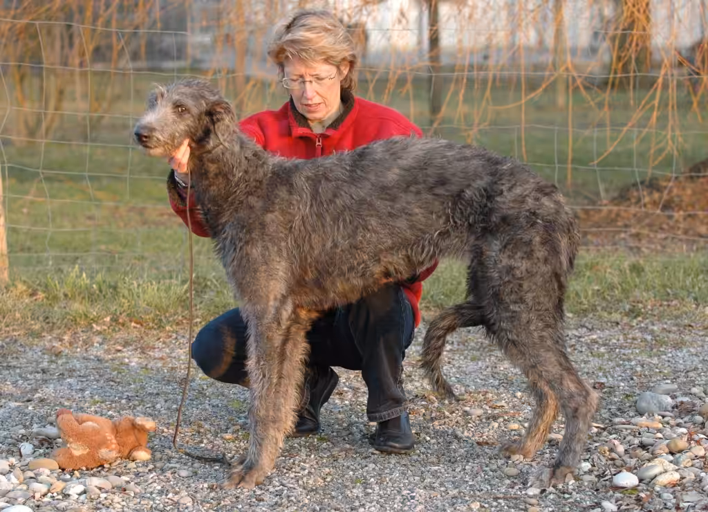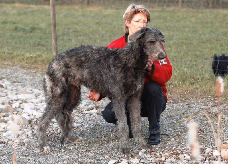 Moira wurde am 22. Mai 1994 bei Charlie und Moira Spence in Schottland geboren und ist eine Cousine von Tulla. Ihre Mutter Rosslyn Chant ist eine Schwester von Tullas Vater Chisum und der berühmten Rosslyn Carric, die im Besitz von Dr. Seumas Caine war. Ursprünglich für eine Freundin ausgesucht, kam Moira dann umständehalber doch direkt aus Schottland zusammen mit Killoeter Echt („Seumas“) zu uns. Bei der Uebernahme mit 14 Wochen war sie der schönste und bezauberndste Deerhound-Welpe, den ich je gesehen hatte. Sie entwickelte sich zu einer – unserer Meinung nach – hochtypischen Hündin, wie ich sie einige Male ganz am Anfang unserer Deerhound-Zeit kennen gelernt hatte: sehr feminin, in keiner Weise auffallend, mit einem sehr leichten, ökonomischen Gangwerk ohne spektakuläre Schwebephasen etc. Ihre Unauffälligkeit ging leider so weit, dass sie an Ausstellungen oft von den Richtern richtiggehend übersehen wurde. Zuhause hingegen erkannte und schätzte jeder Kenner sofort ihren vorzüglichen Typ, zudem hatte sie wohl den grössten Fanclub unserer Hunde. Ihrer starken Eifersucht wegen drängte sie sich zuhause häufig richtig vor.