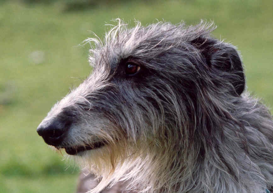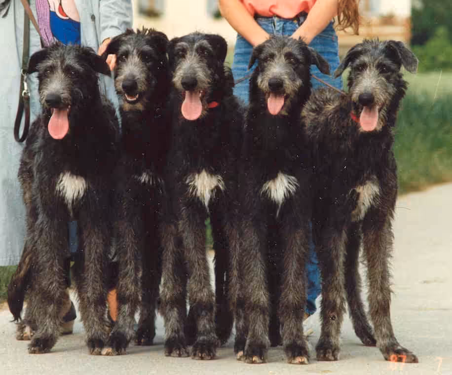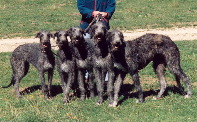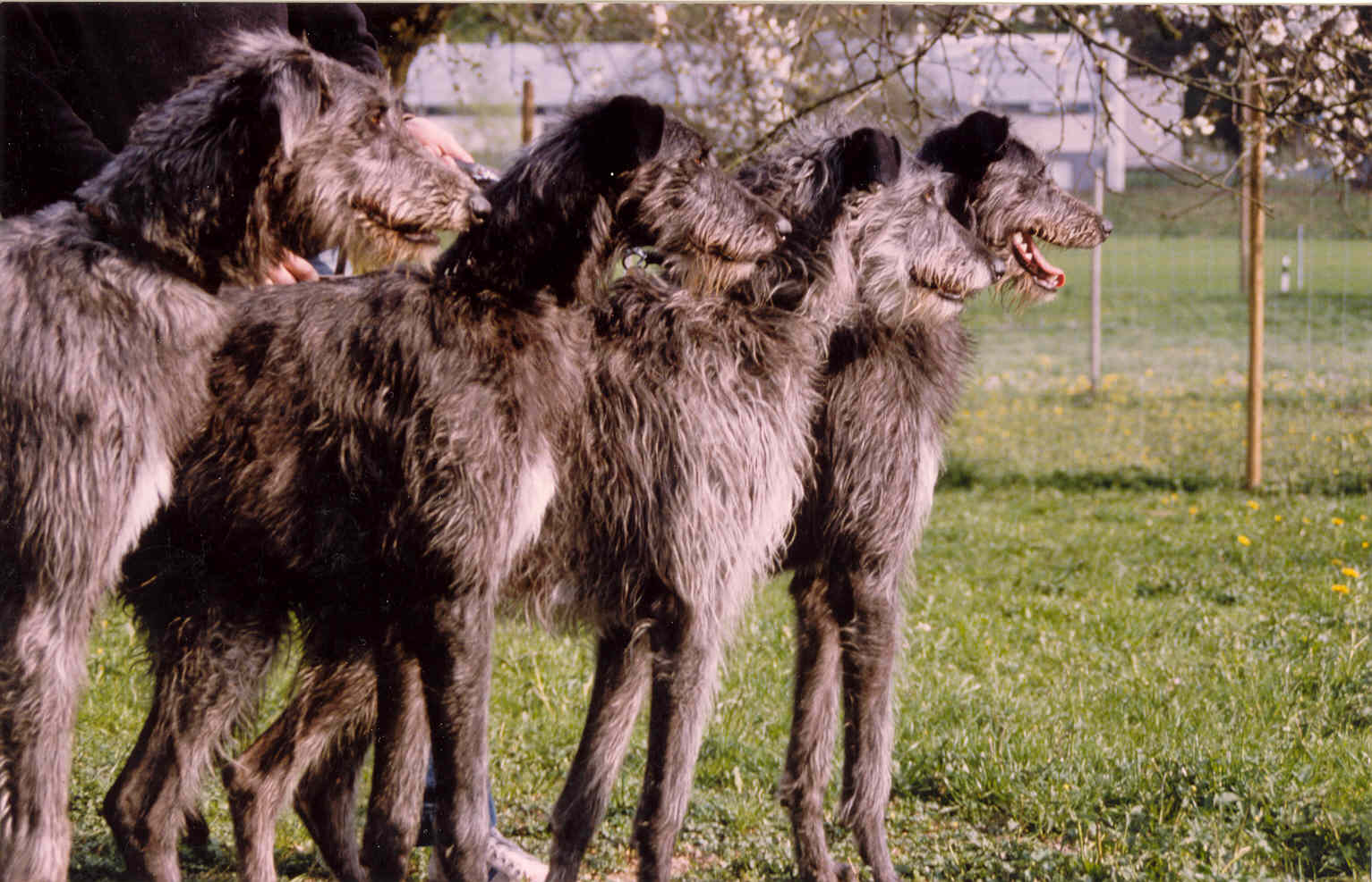 Geworfen am 1.6.81 Für unseren erste Zuchthündin haben wir einen Rüden gesucht, der möglichst ähnlich im Typ ist wie sie, und ihn im Sohn eines Halbbruders gefunden. Der resultierende Wurf ist dann auch tatsächlich vom Typ her recht einheitlich herausgekommen, wobei Fearn, die bei uns blieb, klar die dunkelste und kurzhaarigste war. Farland wurde Stammhündin der Secretis-Deerhounds bei Karin Jansen-Jödicke, Fearn ist die Mutter unseres K- und M-Wurfes.